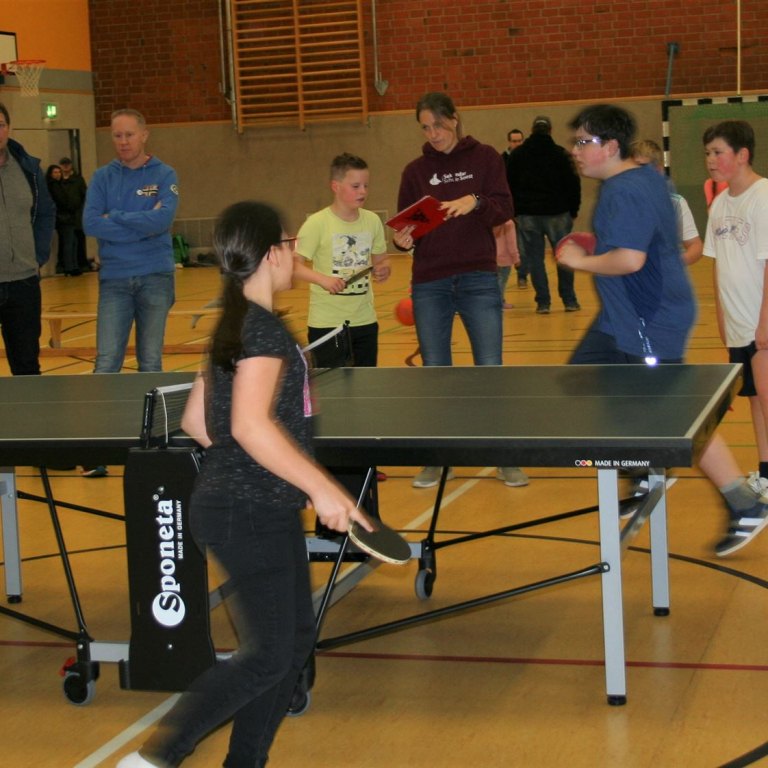 Die für den neuen Schulhof geplanten Sportaktivitäten wurden kurzerhand in die Sporthalle verlegt, wo in Turnierform beim Basketball, Fußball, Tischtennis und bei der Geschwindigkeitsmessung Sieger ermittelt wurden.