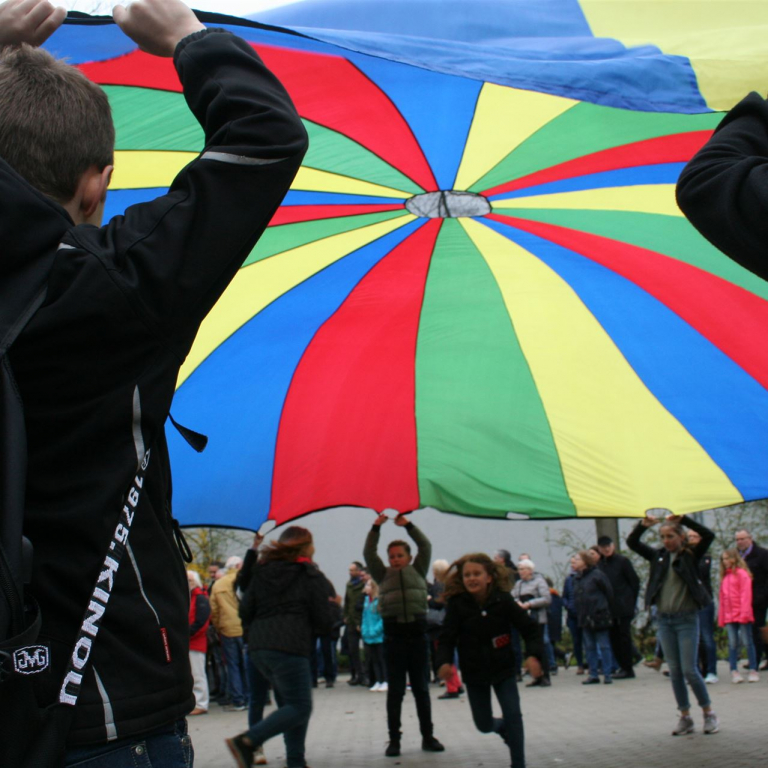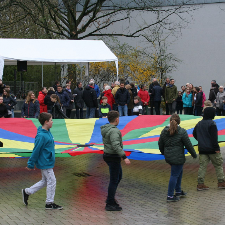 Eröffnet wurde das Schulfest durch den Jahrgang 5, der mit einer bunten Schwungtuchaktion bereits früh für gute Stimmung sorgte. Bürgermeister Dr. Ruthemeyer betonte anschließend in seiner Rede, dass die Stadt Soest froh über die gelungene Neugestaltung des Schulhofes sei. Mit Unterstützung von Landesmittel konnten die Planungen früher als geplant begonnen und abgeschlossen werden.