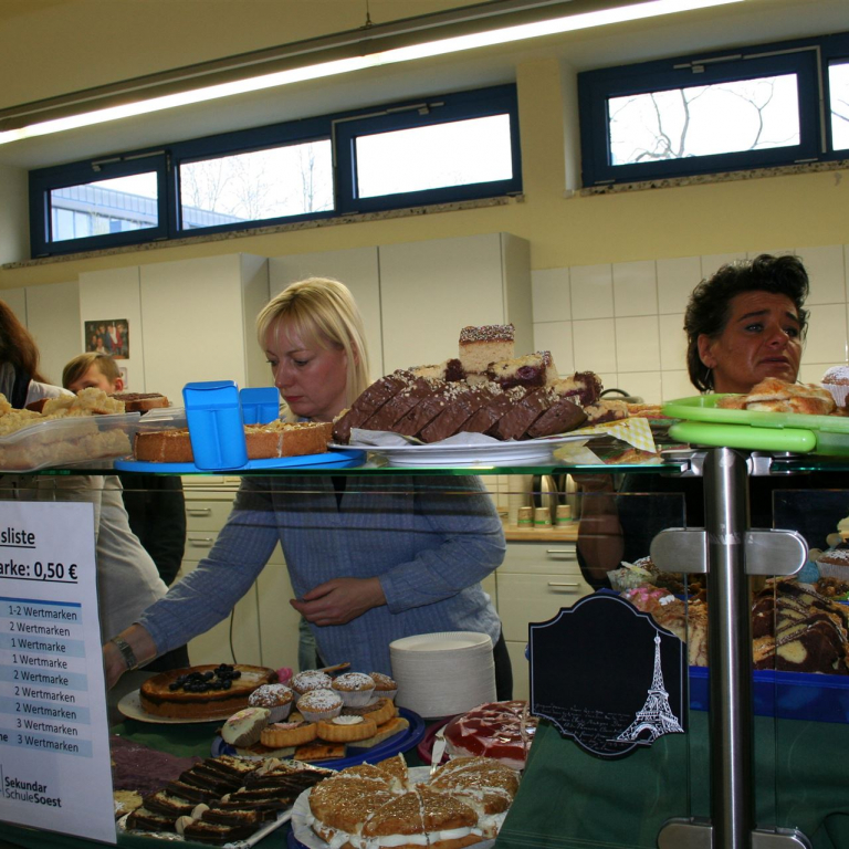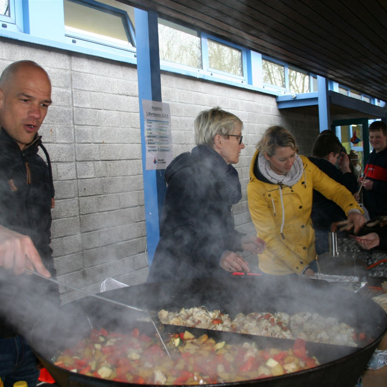 Lange Schlangen gab es bei den Verpflegungsstationen. Die von der Schulpflegschaft organisierte Cafeteria lief Dank der zahlreichen Kuchenspenden und des Einsatzes vieler Eltern genauso reibungslos wie der Grillstand des Fördervereins. Erfrischung bot der Cocktailstand der Jugendkirche.