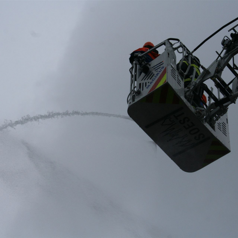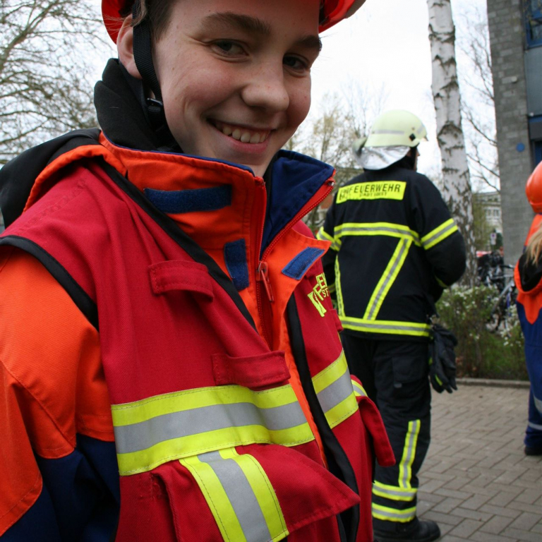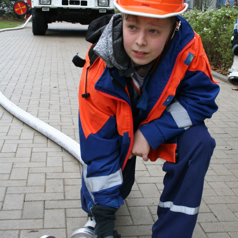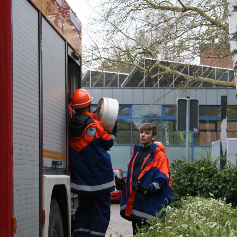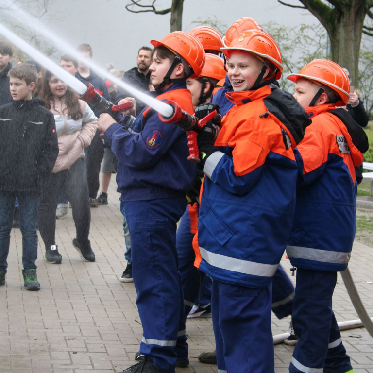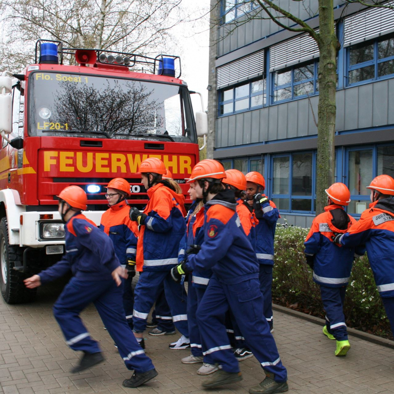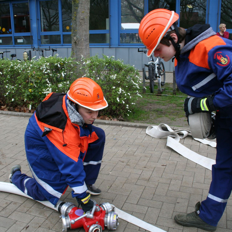 Im Anschluss imponierte die Vorführung der Soester Feuerwehr, die mit Schüler*Innen des Jahrgangs 8 mit Blaulicht und Martinshorn auf den Schulhof fuhr und eine Löschübung demonstrierte. Eine eindrucksvolle Demonstration der lohnenden Kooperation zwischen der Sekundarschule und der Feuerwehr. Ganz spontan und in einer Blitzaktion hat die Feuerwehr am Mittag noch einen Pavillon über der Bühne aufgebaut.